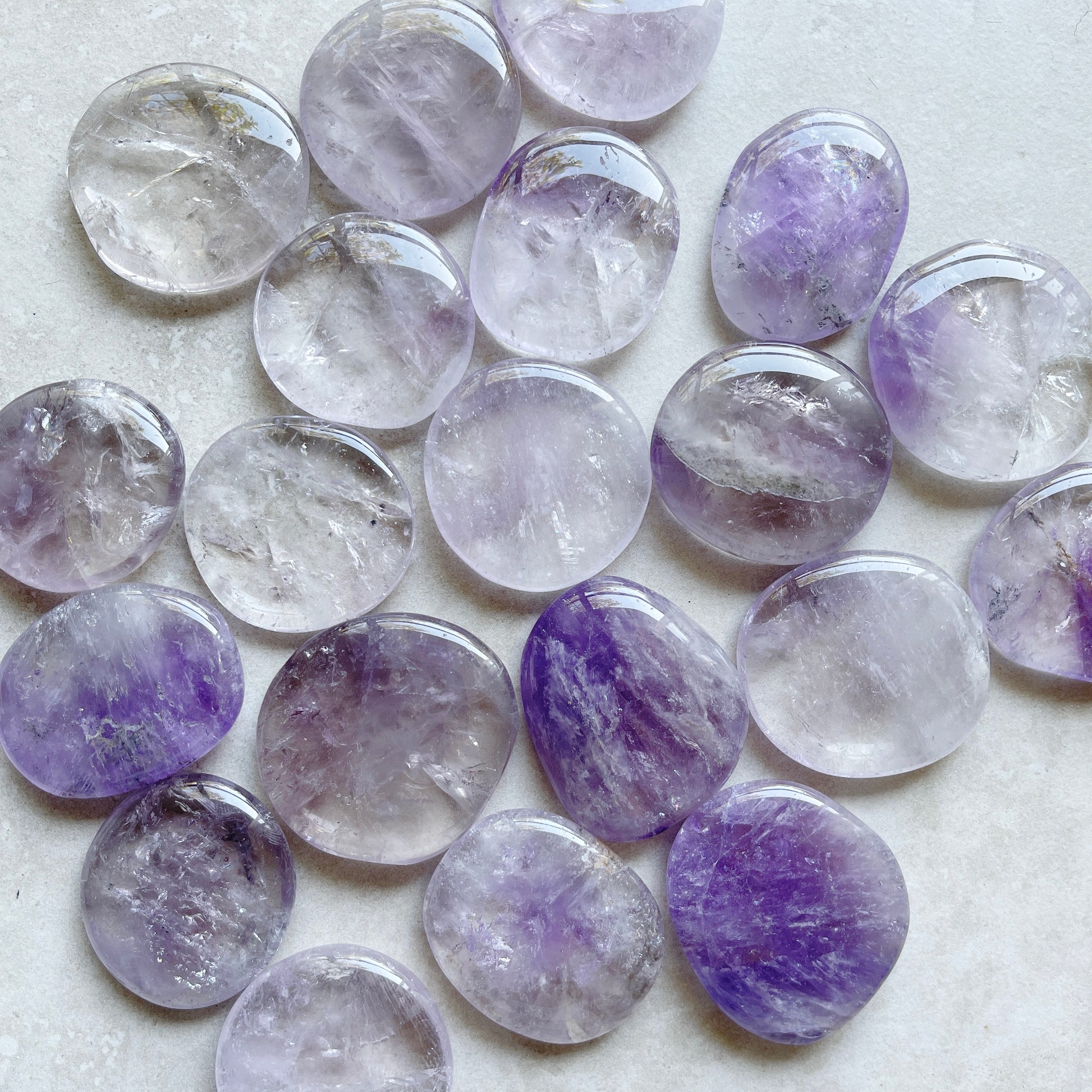You will receive one amethyst flat stone. Chosen intuitively for you, please note each piece is natural and may vary slightly. Reminder this is a natural crystal, marks and inconsistencies are not flaws but are part of the crystal.
