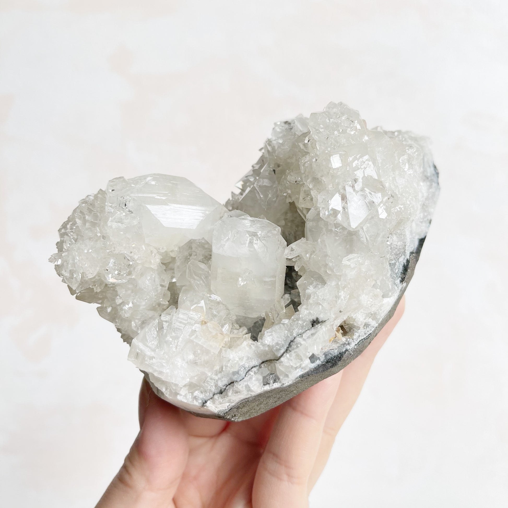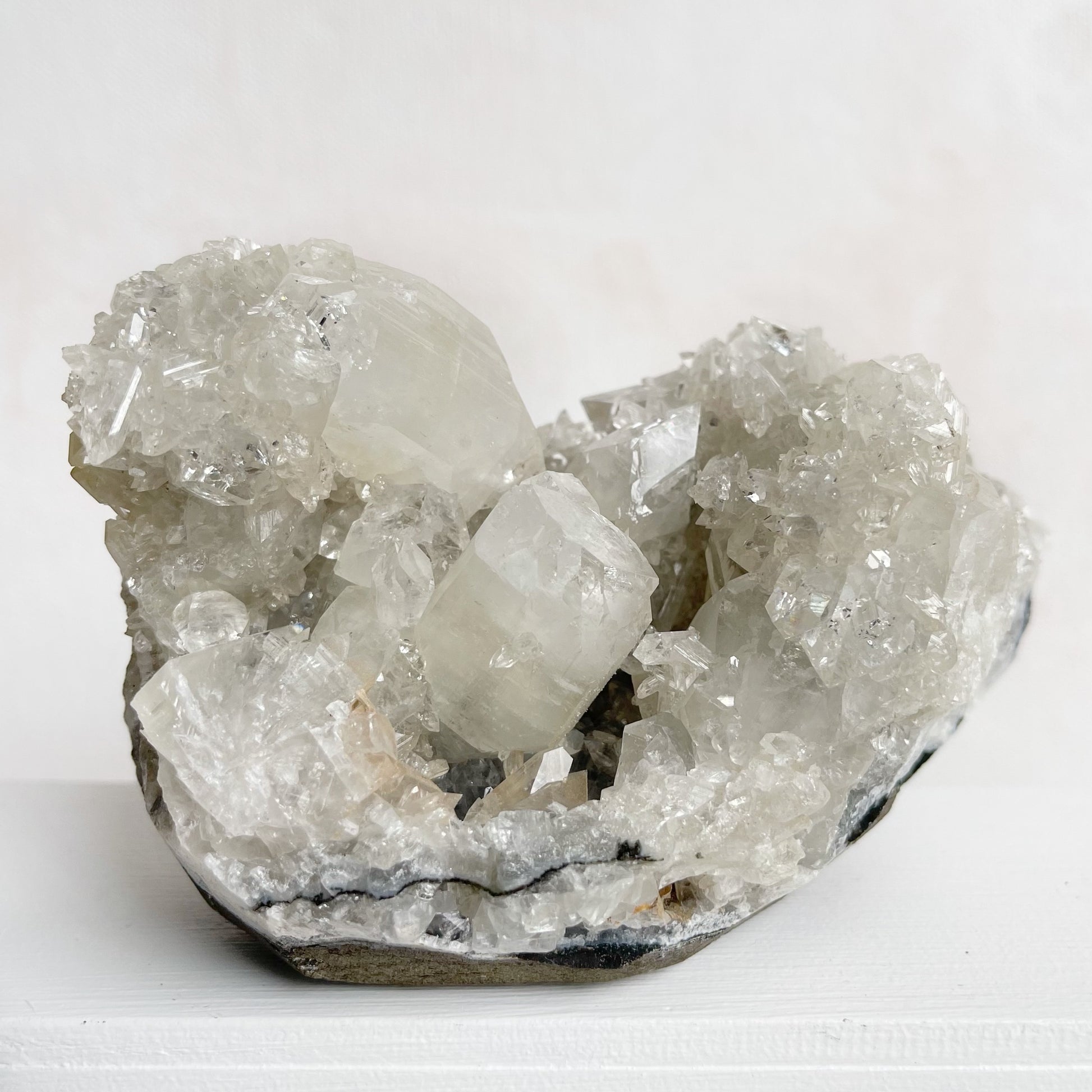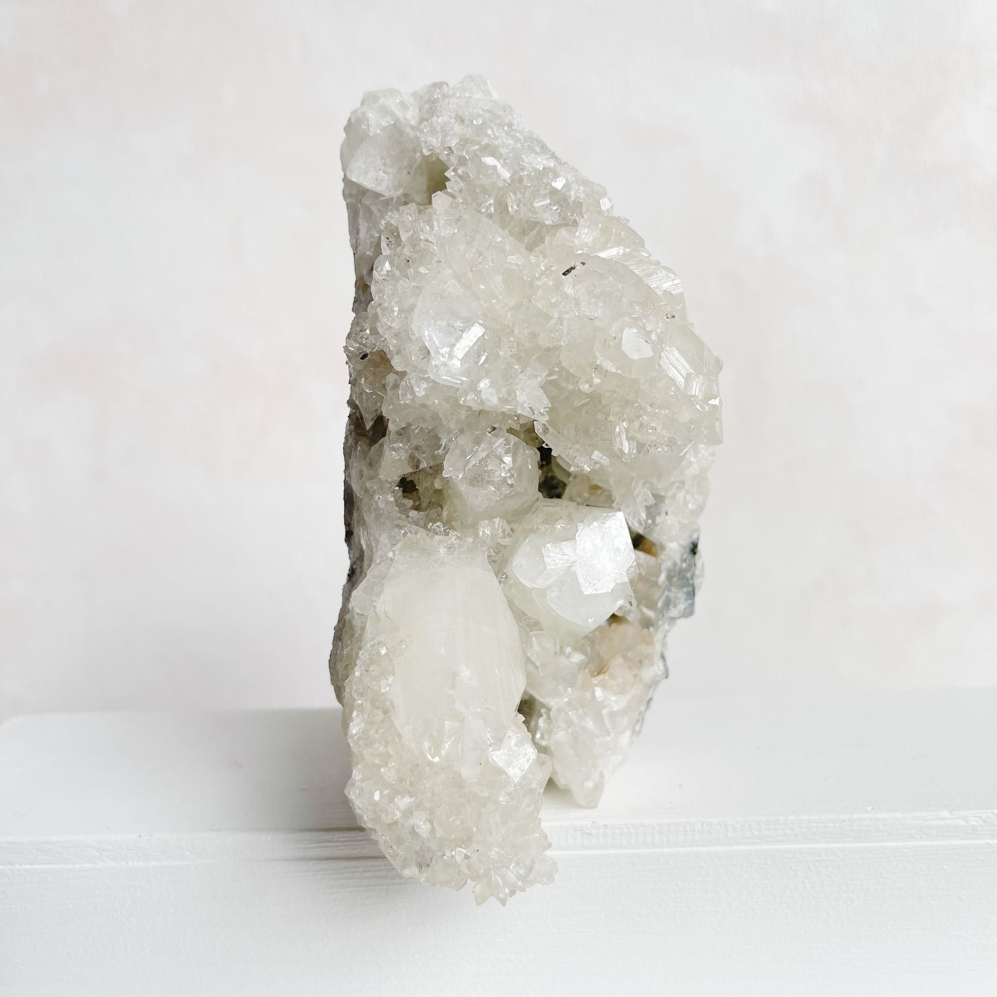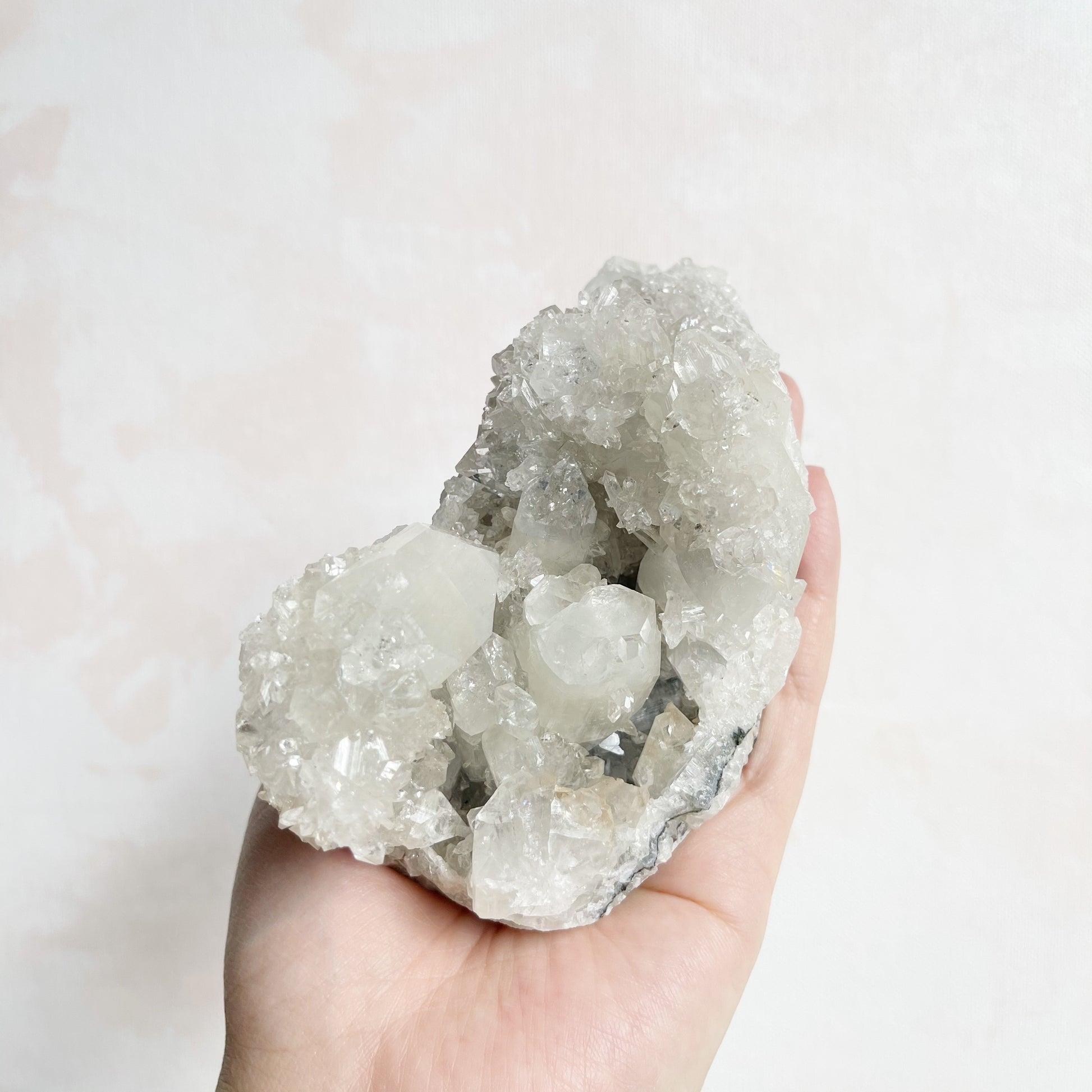 Apophyllite connects the physical and spiritual realms. It has the ability to attune to higher frequencies of energies, access multi dimensions, a window to other worlds and inter-dimensional travel. Apophyllite can be used to contact guardian angels and spirit guides or to access high angelic realms and help develop prophetic vision. Meditating and working with Apophyllite has a calming effect, ideal for those wanting to reduce stress, clear mental blockages and release negative though patterns. Also, Apophyllite can assist those wanting to overcome their anxiety, worries and fears. Having Apophyllite in the home can create a spiritual environment with a sense of purity.