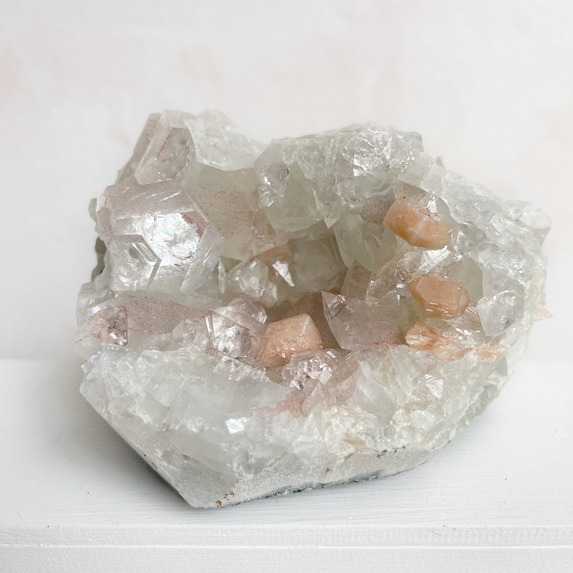 Apophyllite connects the physical and spiritual realms. It has the ability to attune to higher frequencies of energies, access multi dimensions, a window to other worlds and inter-dimensional travel. Apophyllite can be used to contact guardian angels and spirit guides or to access high angelic realms and help develop prophetic vision. Meditating and working with Apophyllite has a calming effect, ideal for those wanting to reduce stress, clear mental blockages and release negative though patterns. Also, Apophyllite can assist those wanting to overcome their anxiety, worries and fears. Having Apophyllite in the home can create a spiritual environment with a sense of purity.