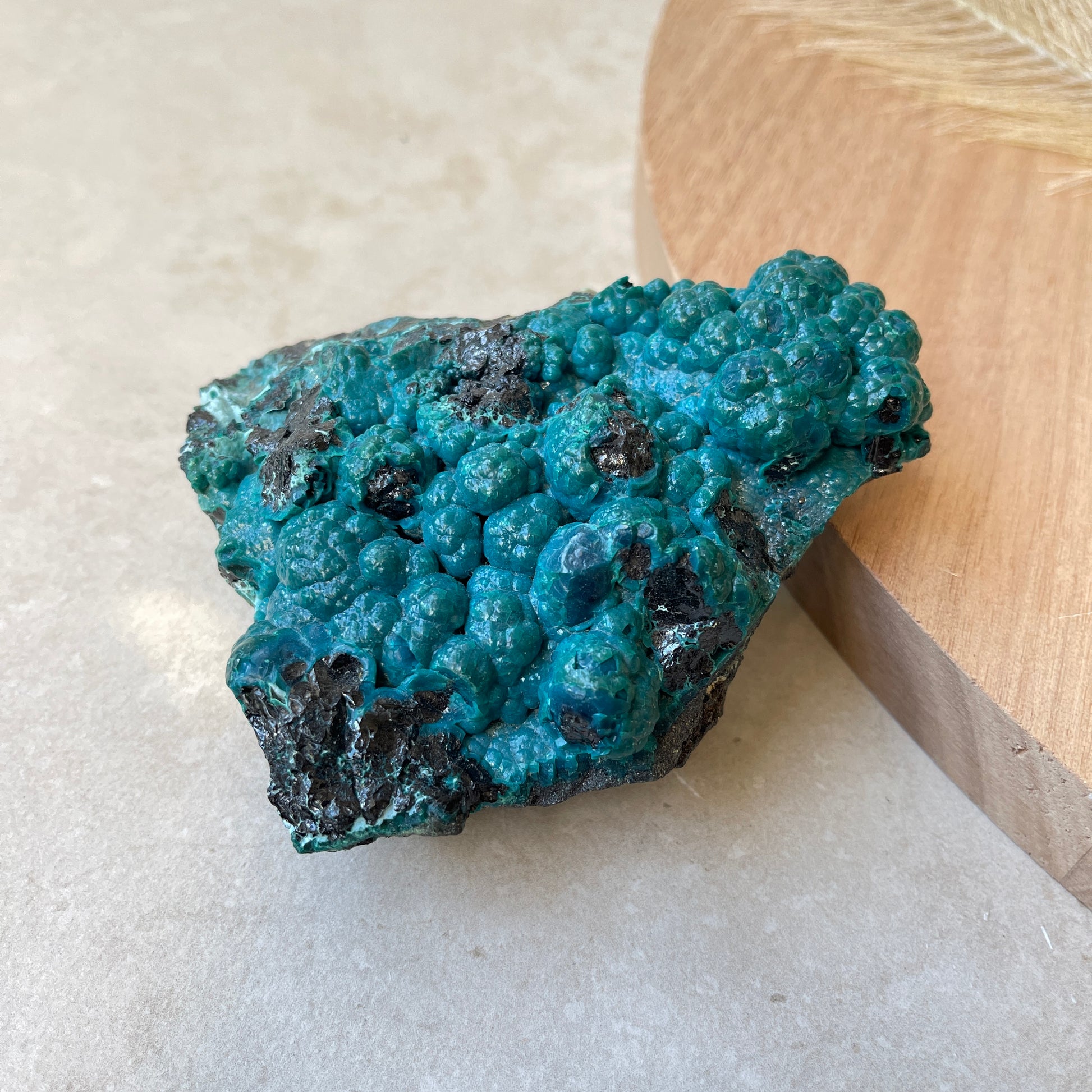 Chrysocolla is a fairly soft stone, measuring 2 - 4 on the MOHS scale. This specimen is Chrysocolla with some Cornetite, Malachite and Heterogenite.