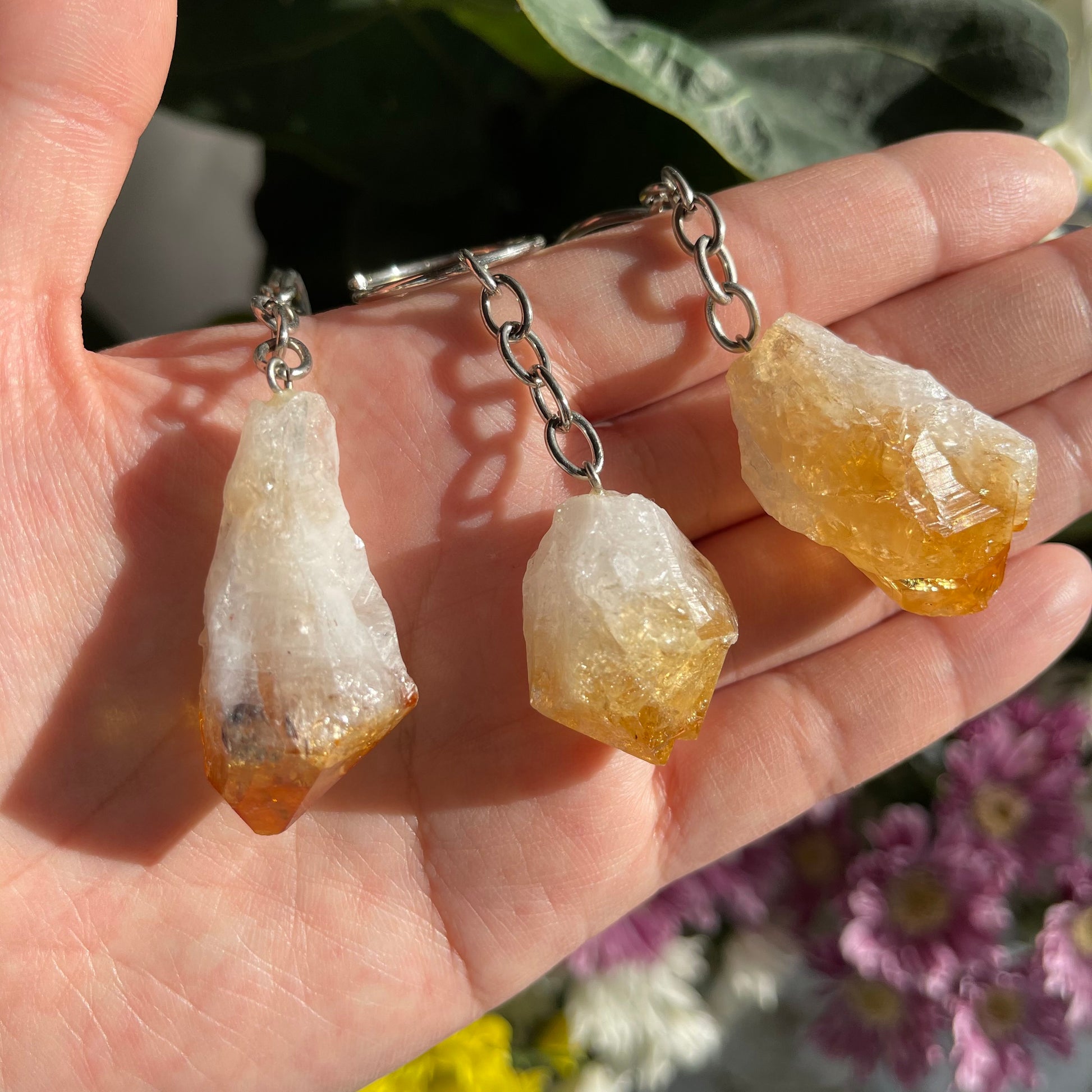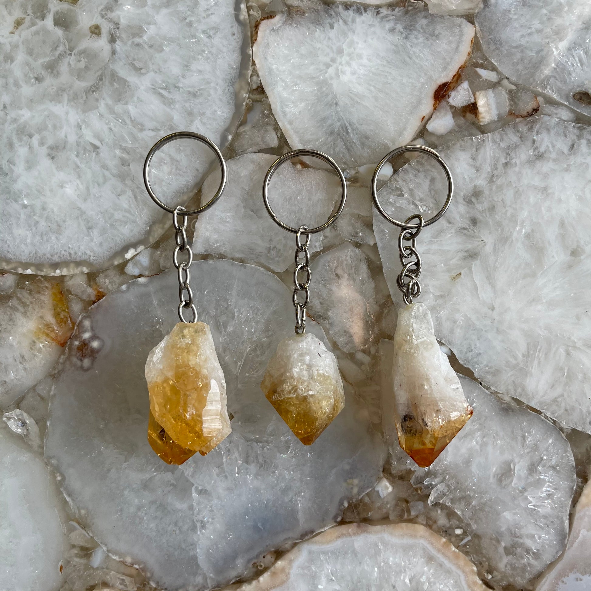 You will receive one citrine key chain. Chosen intuitively for you, please note each piece is natural and may vary slightly. Reminder this is a natural crystal, marks and inconsistencies are not flaws but are part of the crystal.