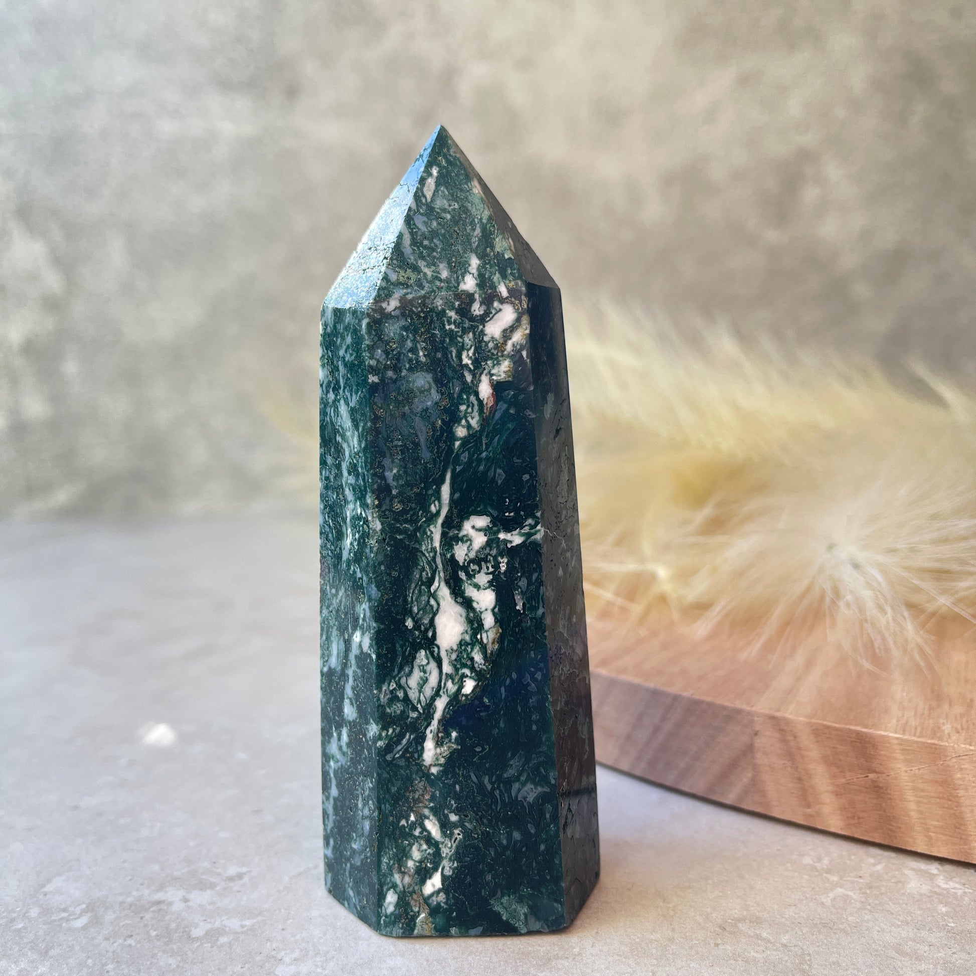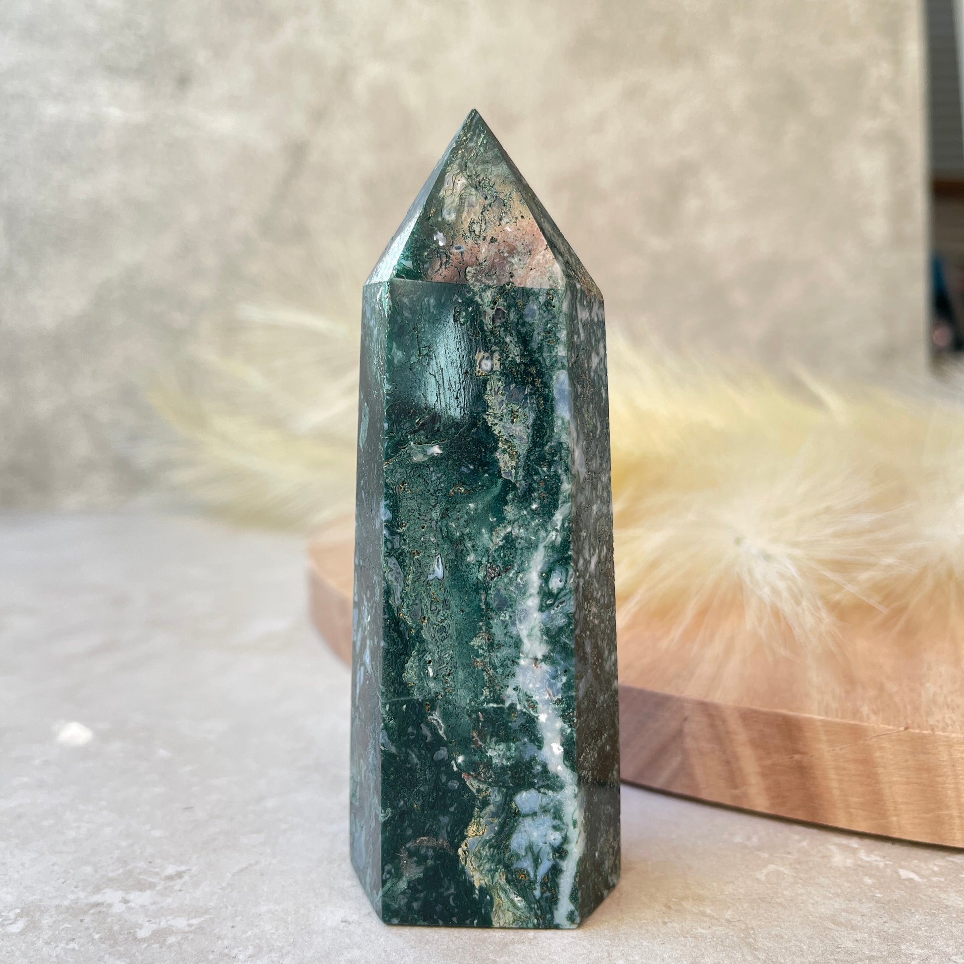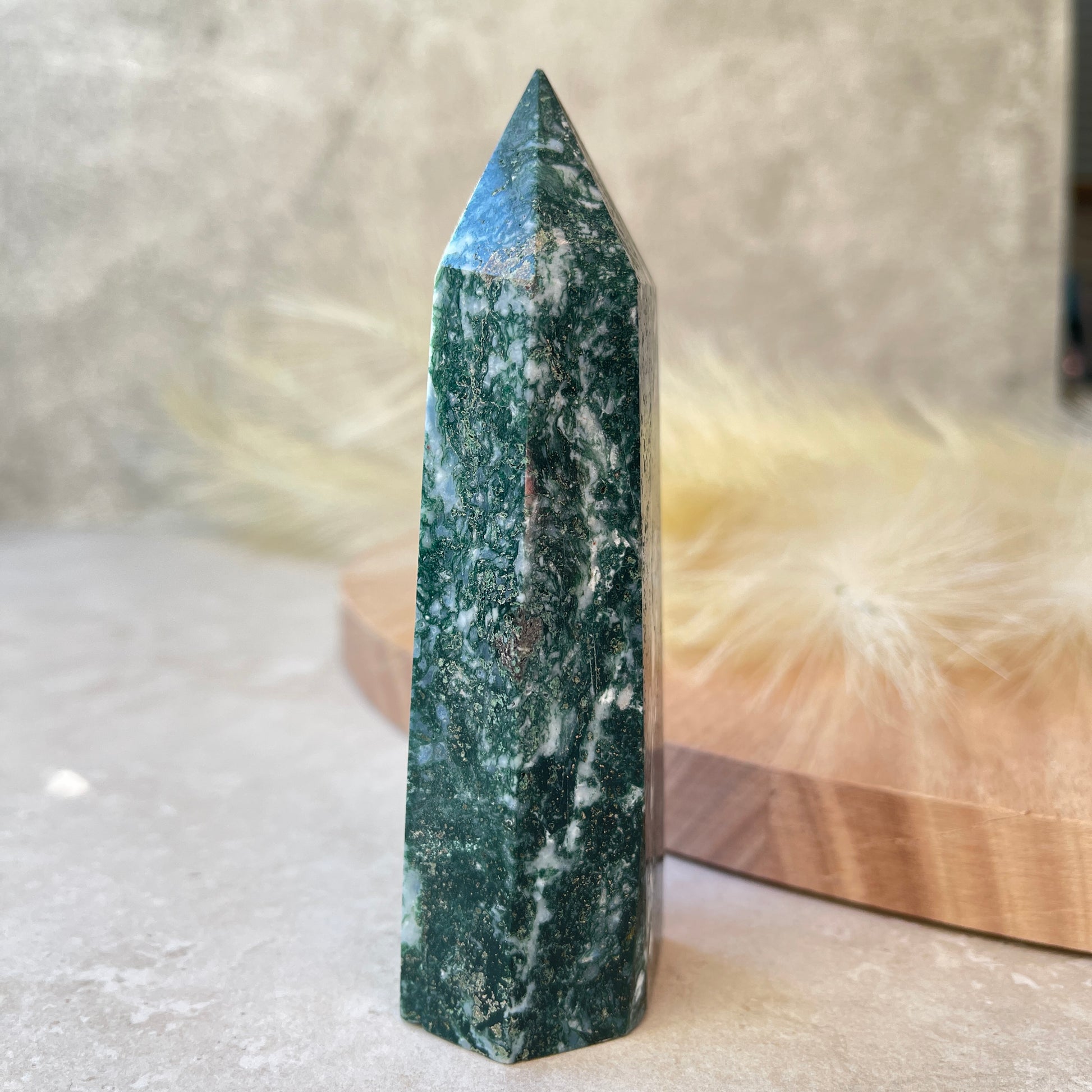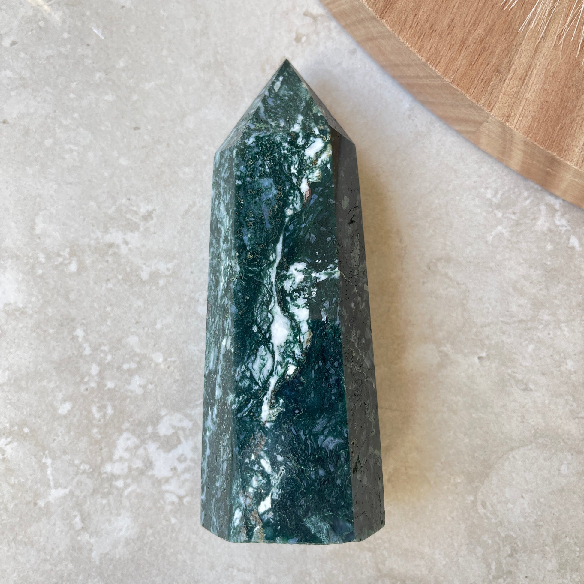 Moss Agate is a type of chalcedony formation and despite it being named an Agate, it doesn't display the traditional banding patterns seen in most Agate crystals. Instead the mineral composition and inclusions create the green moss like patterns in the stone. Moss Agate is said to attract abundance, wealth and prosperity. Use Moss Agate for new beginnings, it brings balance and stability. Moss Agate is calming and peaceful therefore, good for times of stress.