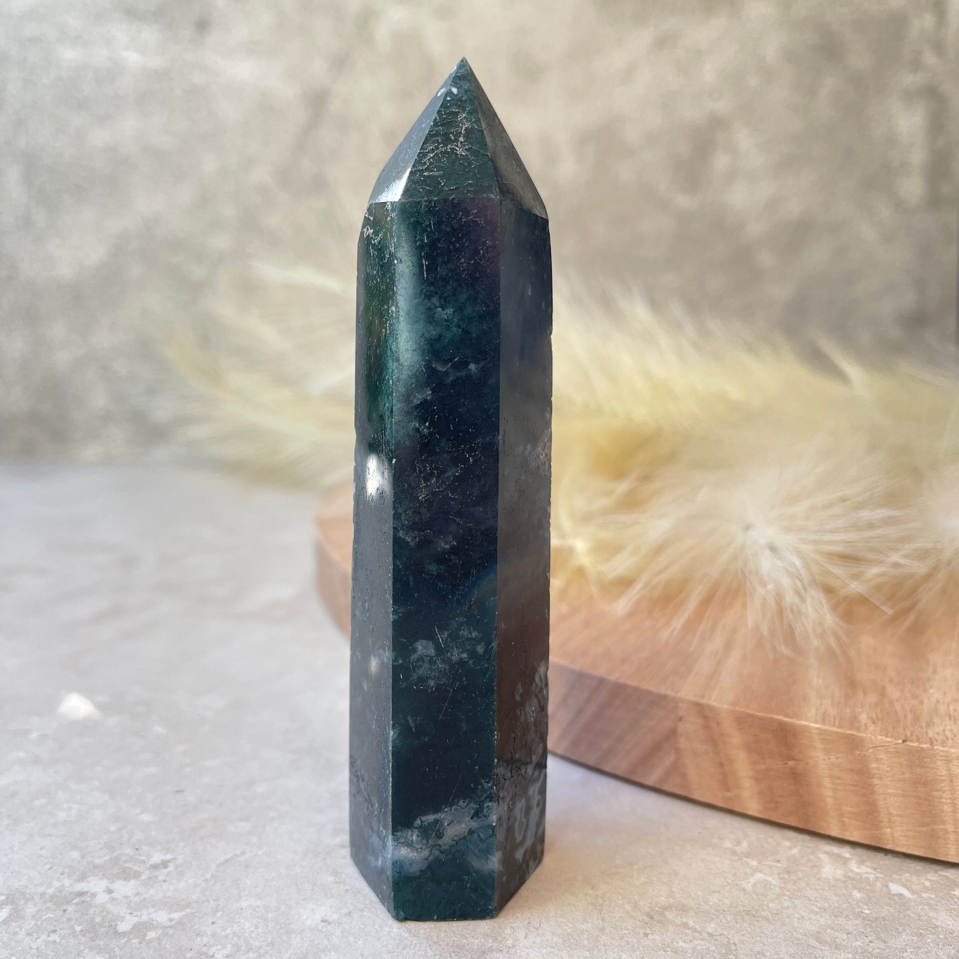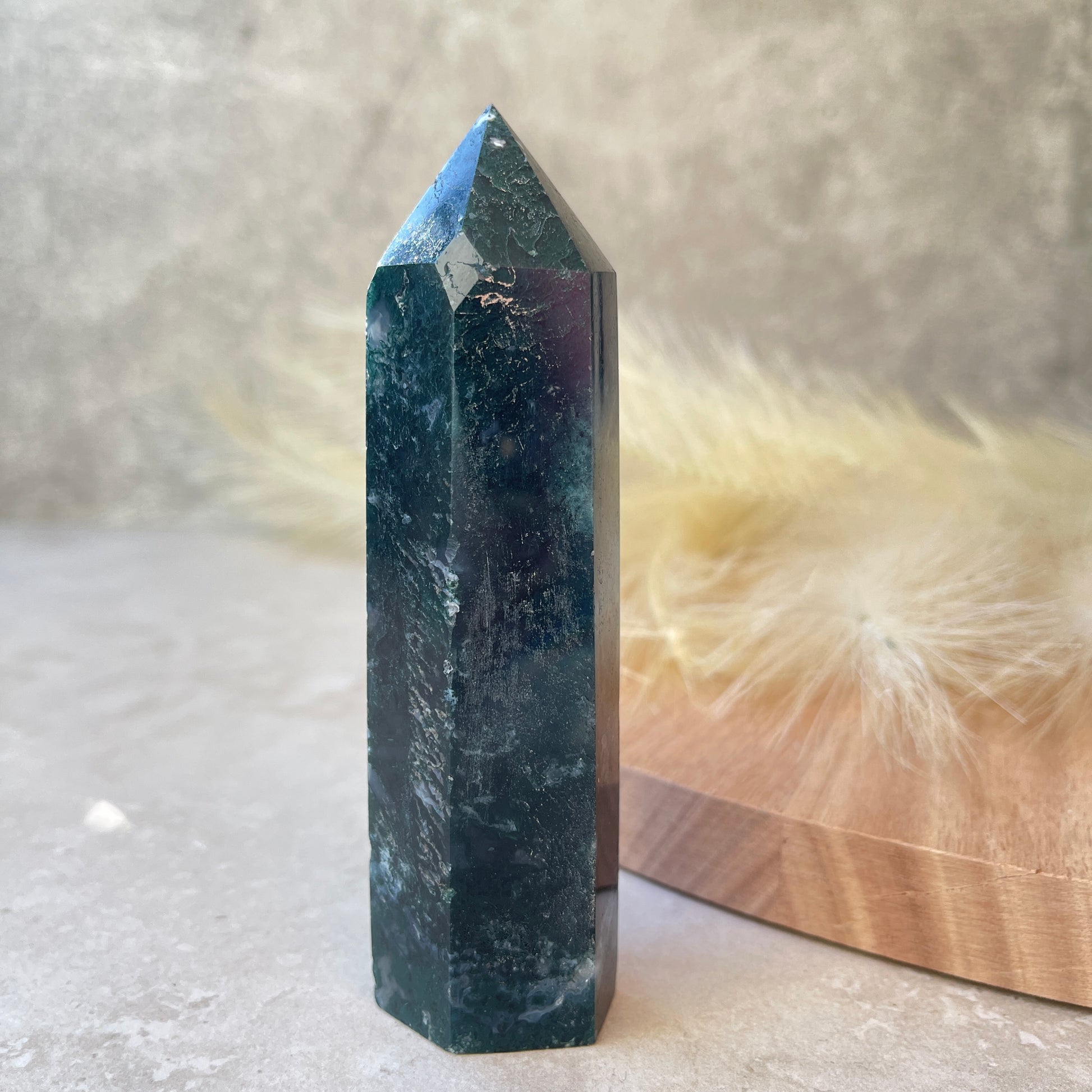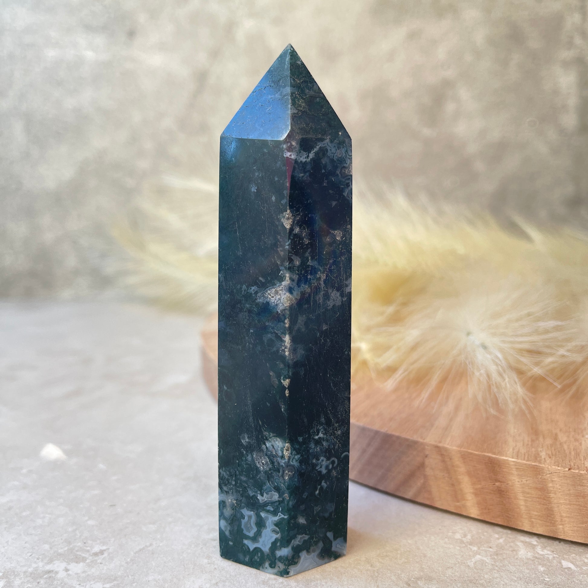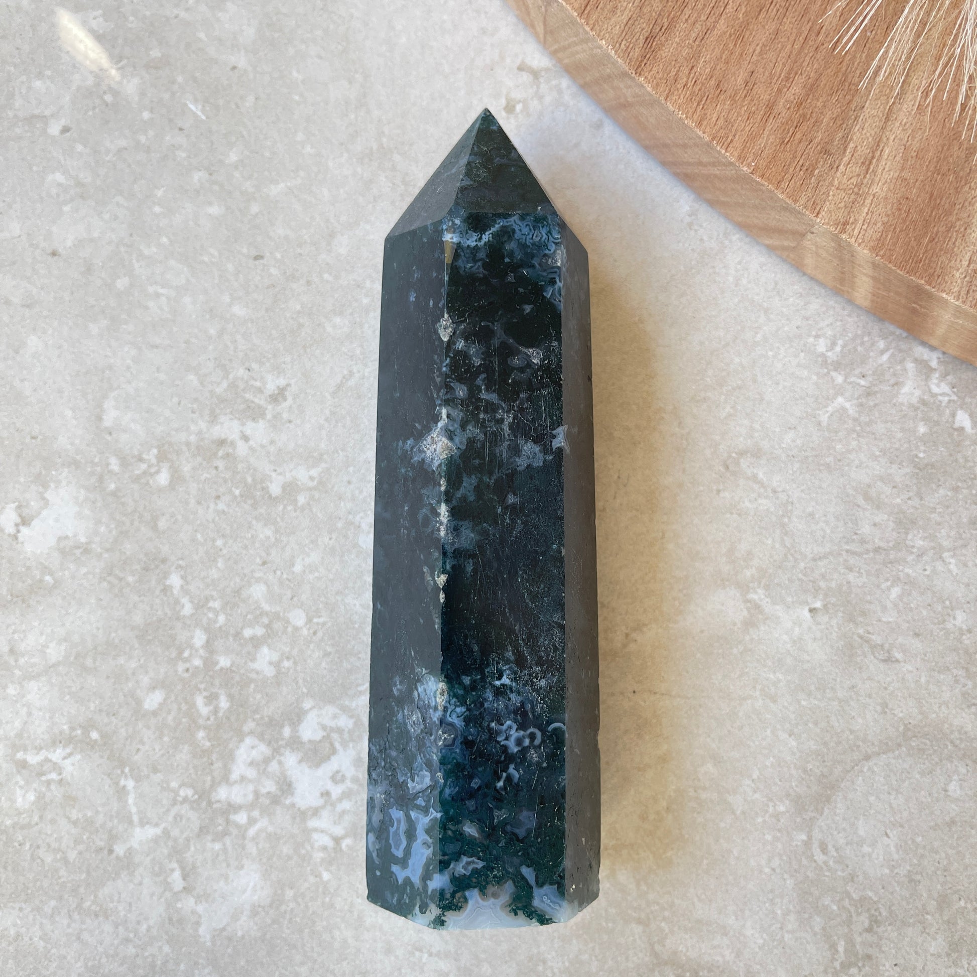 Moss Agate is a type of chalcedony formation and despite it being named an Agate, it doesn't display the traditional banding patterns seen in most Agate crystals. Instead the mineral composition and inclusions create the green moss like patterns in the stone. Moss Agate is said to attract abundance, wealth and prosperity. Use Moss Agate for new beginnings, it brings balance and stability. Moss Agate is calming and peaceful therefore, good for times of stress.