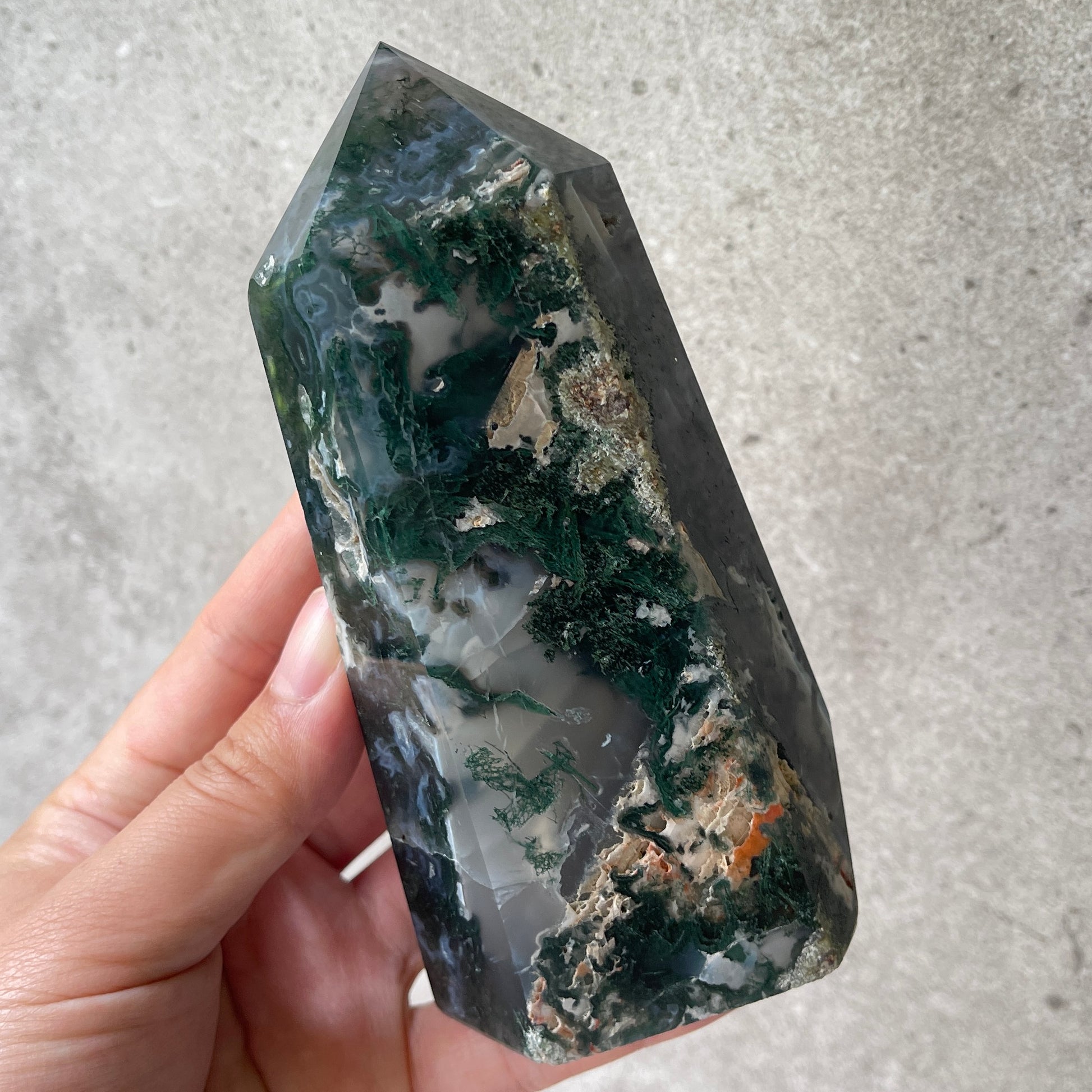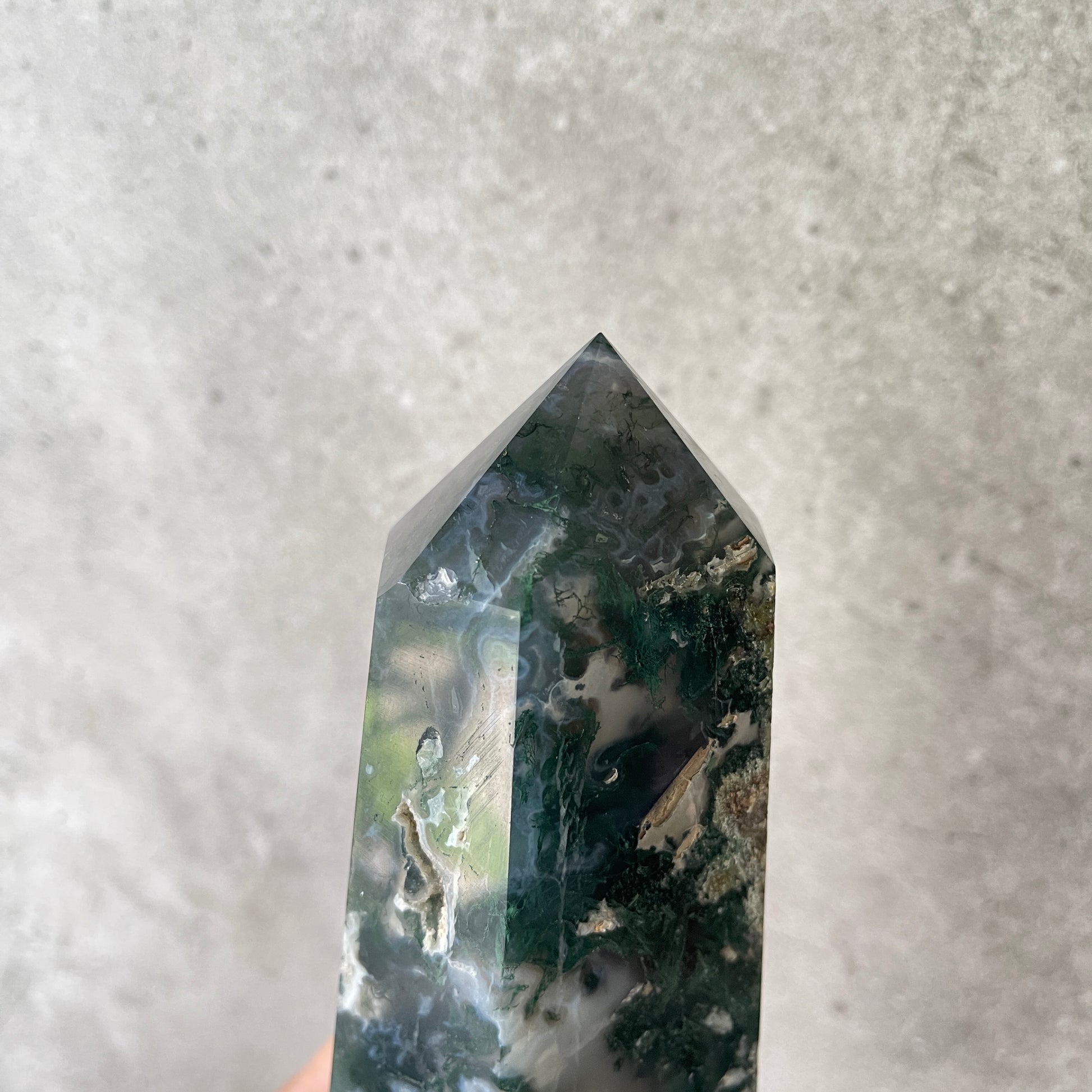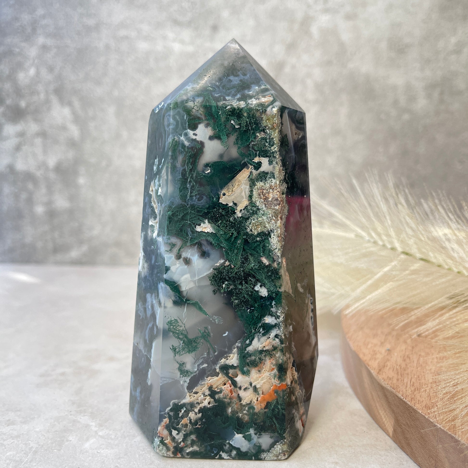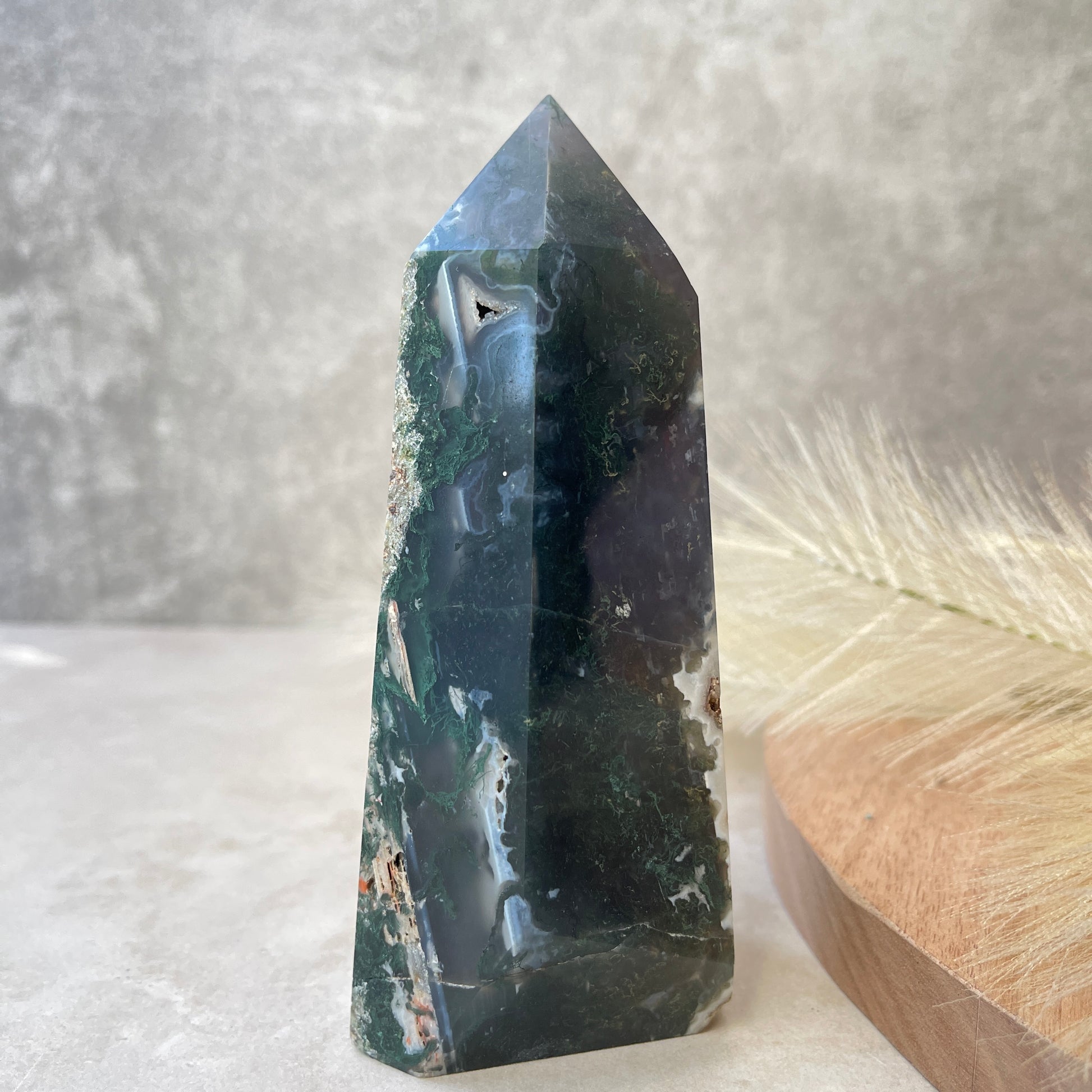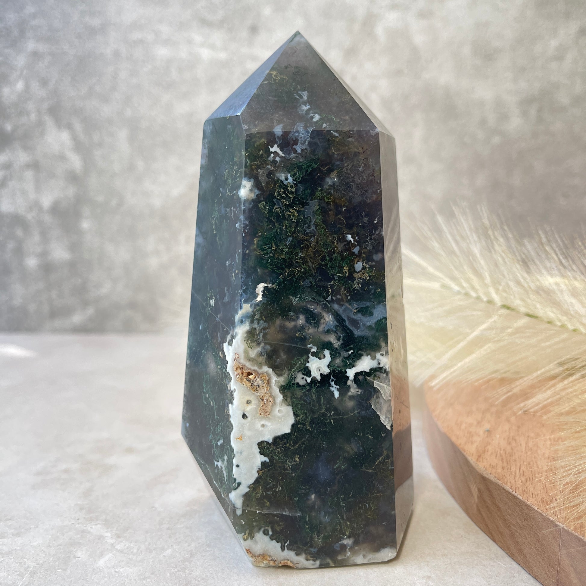 Moss Agate is a type of chalcedony formation and despite it being named an Agate, it doesn't display the traditional banding patterns seen in most Agate crystals. Instead the mineral composition and inclusions create the green moss like patterns in the stone. Moss Agate is said to attract abundance, wealth and prosperity. Use Moss Agate for new beginnings, it brings balance and stability. Moss Agate is calming and peaceful therefore, good for times of stress.