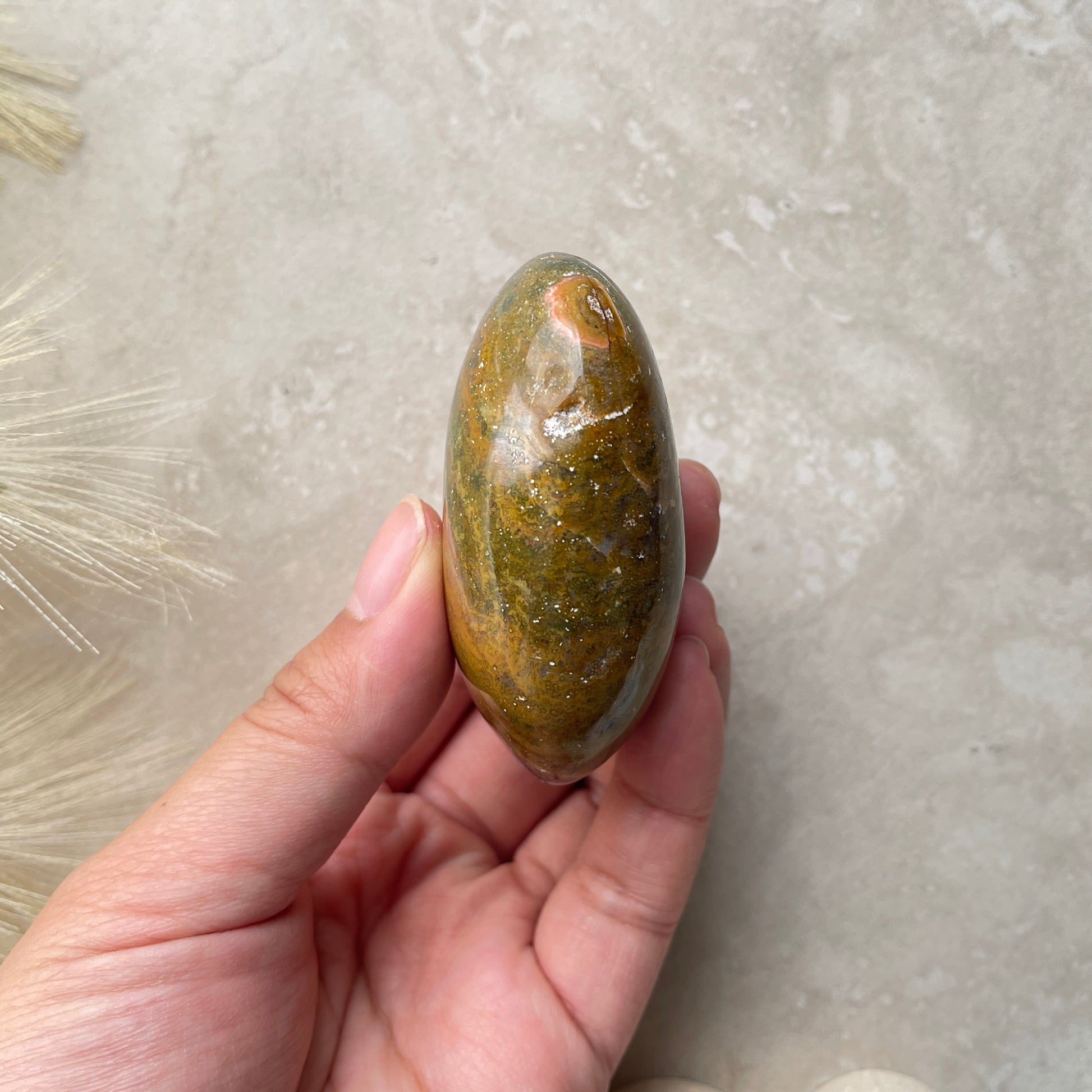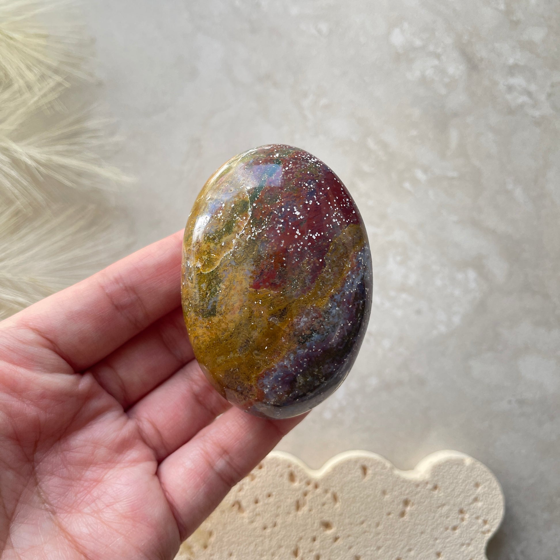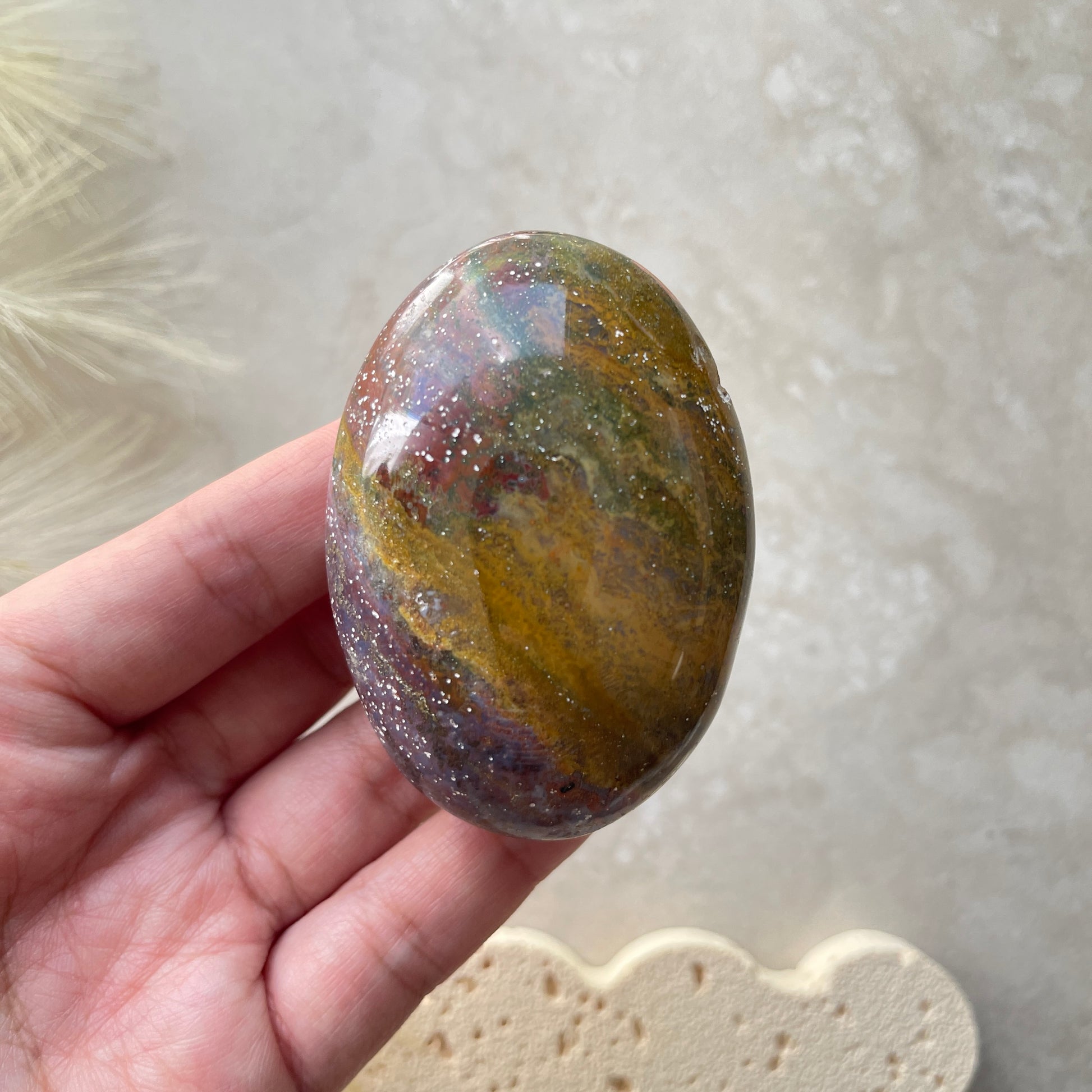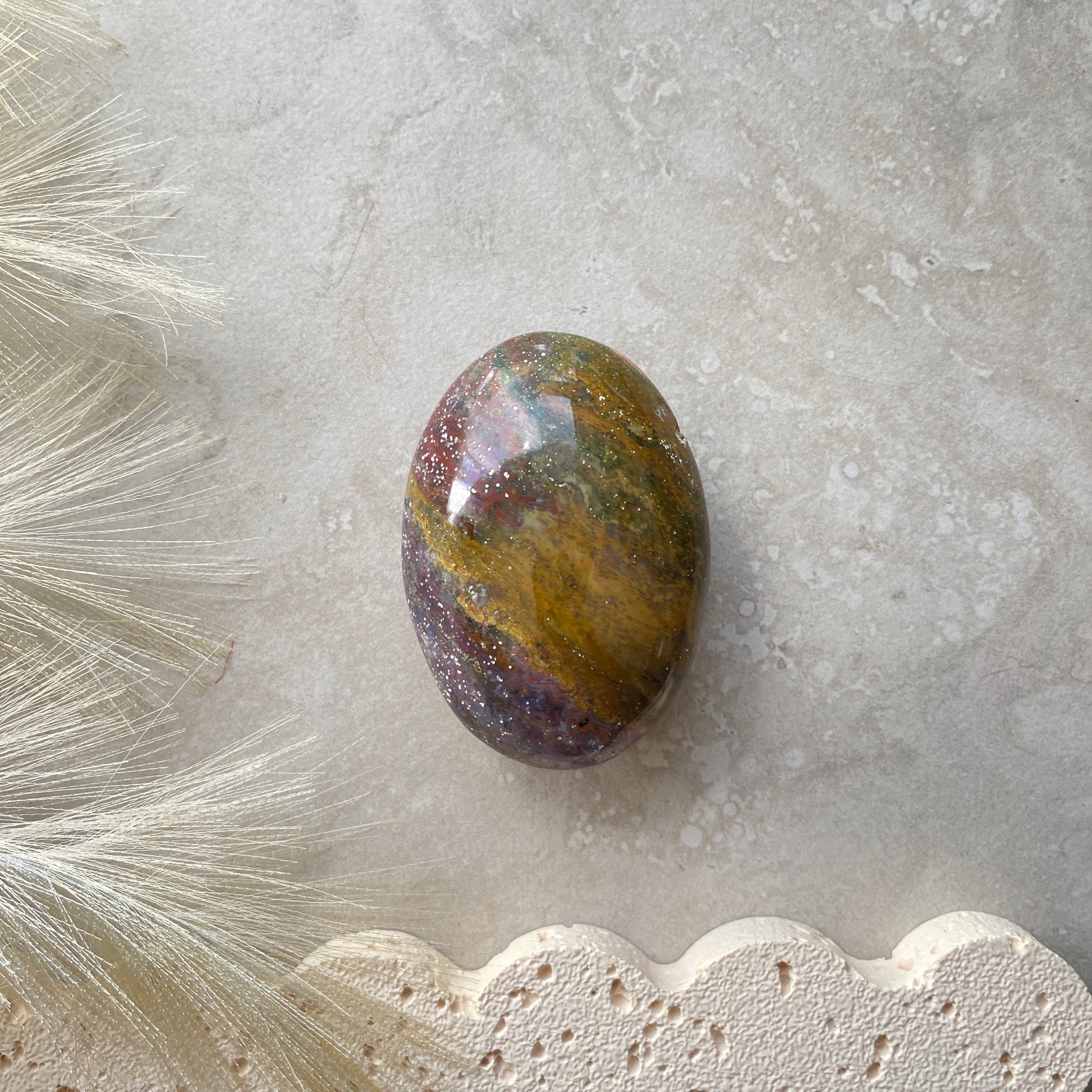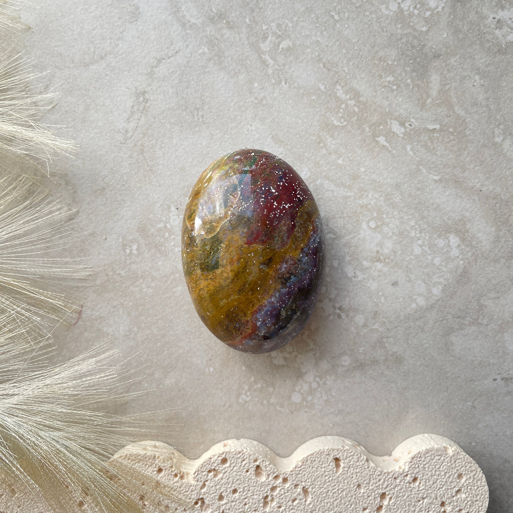 Ocean Jasper is a joyful uplifting stone found in Madagascar. It has a various range of colours and wild patterns making each stone unique and no two the same. Colours range from red, yellow, pink, green, blue, white and black. Hold and meditate with Ocean Jasper to let go of unwanted thoughts and calm the mind. It reminds you to go with the flow, focus on day by day, be in and value the present and not worry about the future or past.