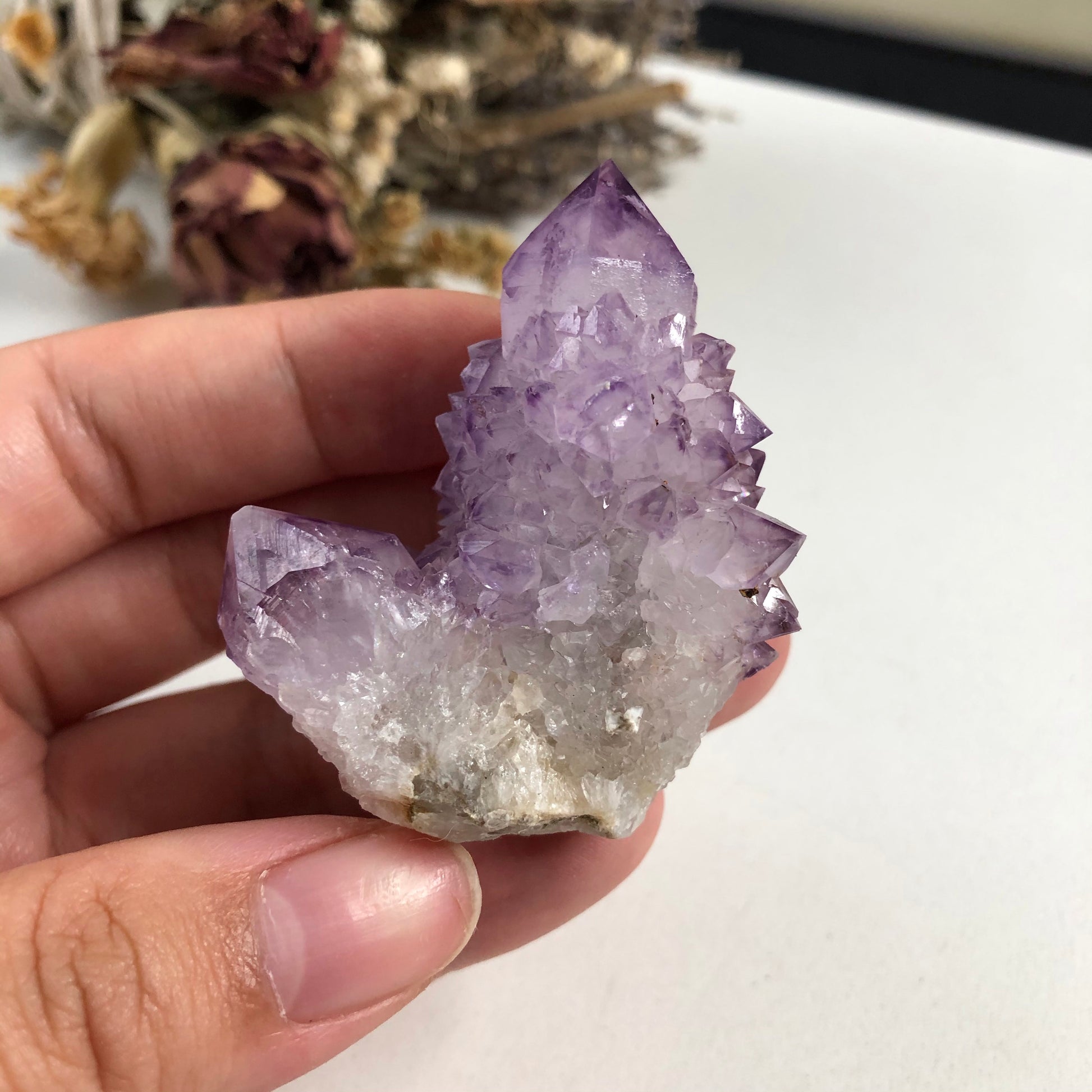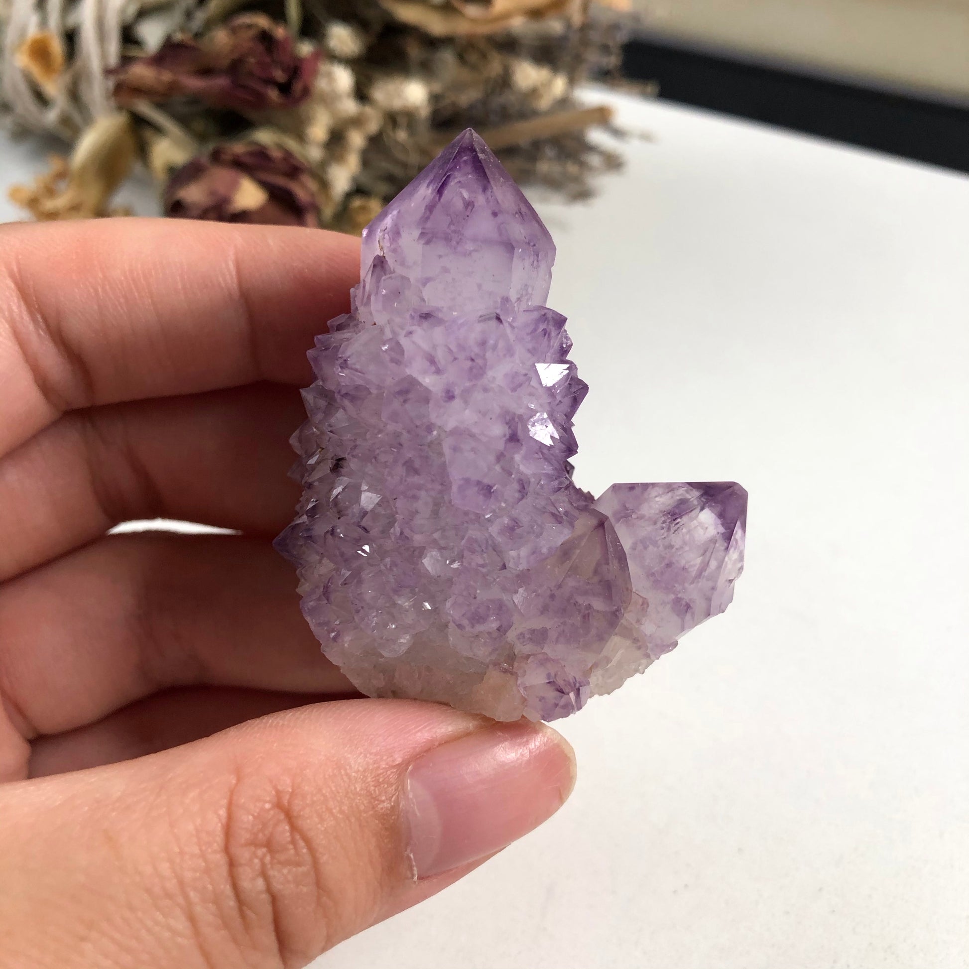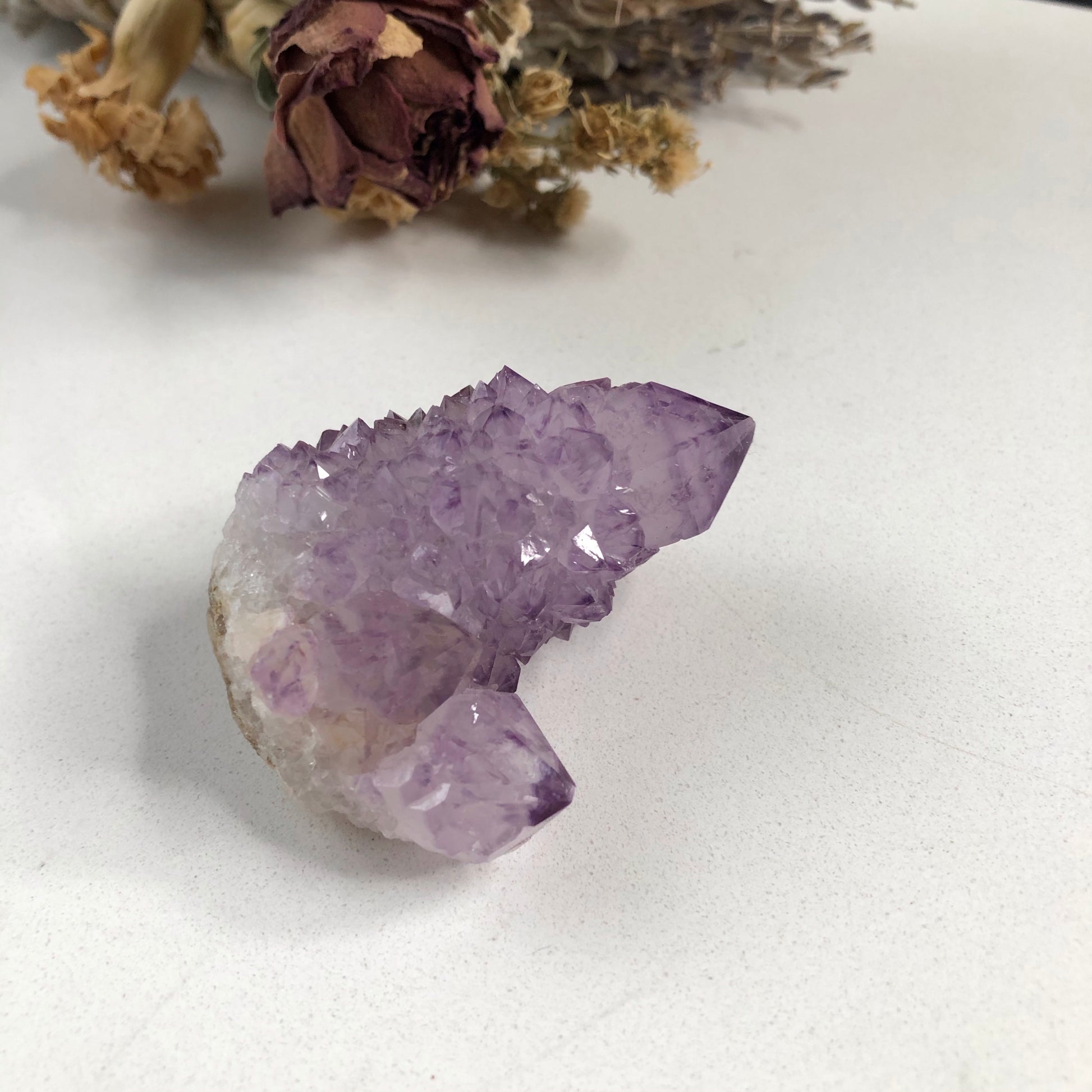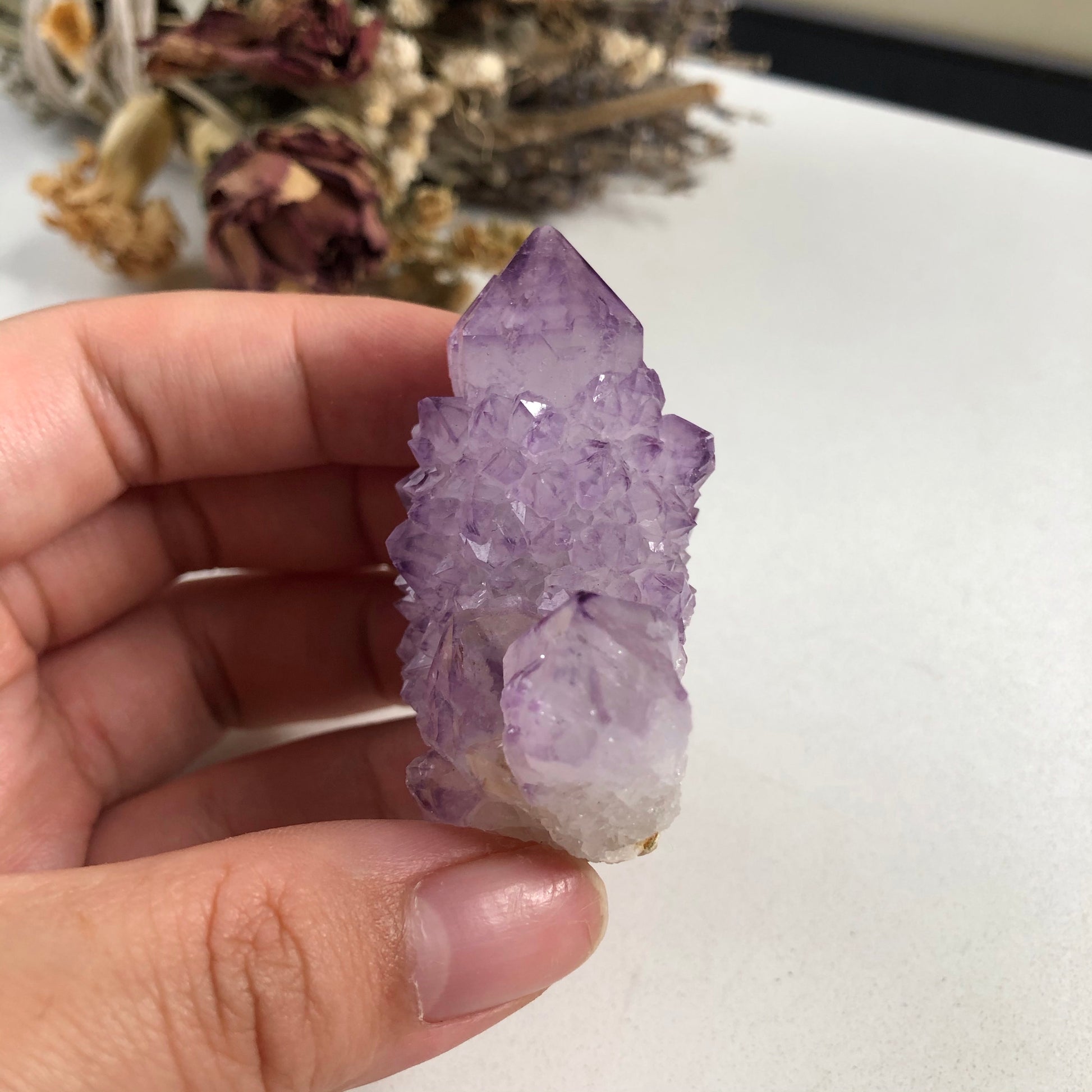 Spirit Quartz also known as Fairy or Cactus Quartz because of the candle stick shape it forms with lots of tiny crystal points on one larger point. It is a variety of Amethyst only found in mines in South Africa. Spirit Quartz can be found in various tones of purple, white and yellow/brown due to iron inclusions in the formation. It is a high vibrational crystal, which connects you to your higher self use it to manifest and connect with your spirit guides. Spirit Quartz has a powerful vibration that emits from the points in all directions, it brings joyful and uplifting energies. Use it to overcome your fears and insecurities. It is said to also be useful for those who want to enhance their emotions of compassion and generosity. Ideal for those whose work involves healing, transformation and creativity, for example, healers and teachers.